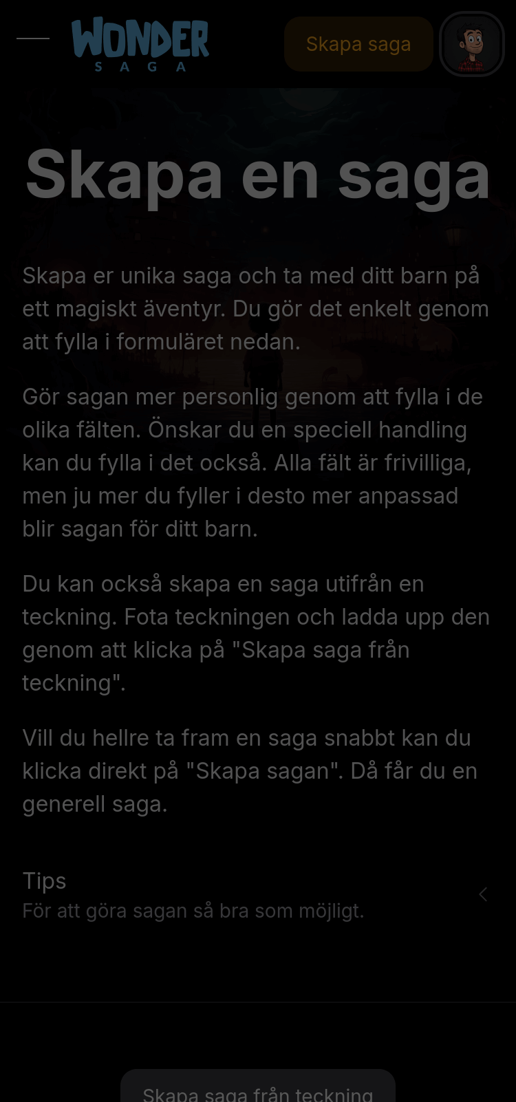 Med Wonder Saga skapar du enkelt en berättelse efter era idéer – en saga som kan ha ditt barn som hjälten eller handla om något helt annat. Fyll i så mycket eller lite detaljer som ni vill, så skapas sagan automatiskt på några sekunder.